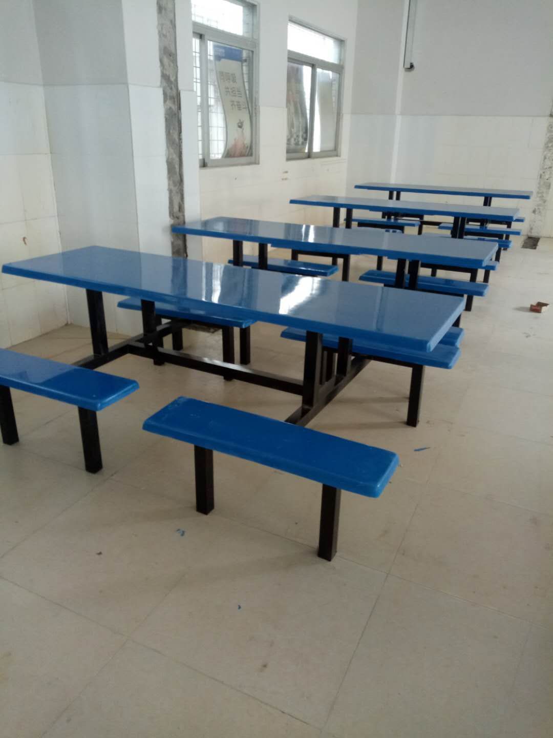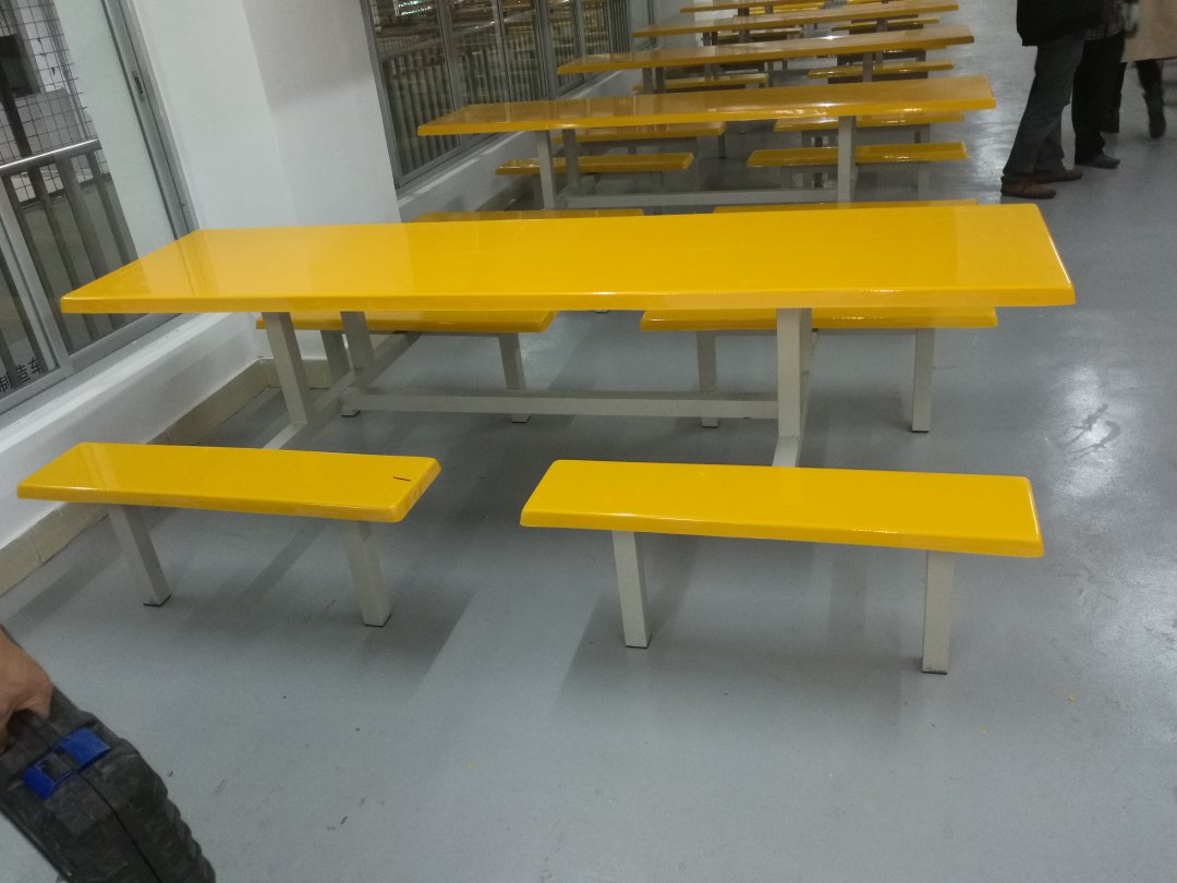 桌麵凳麵(miàn)玻璃鋼材質(zhì),支架鍍鋅管焊接,表麵烤漆灰白色。